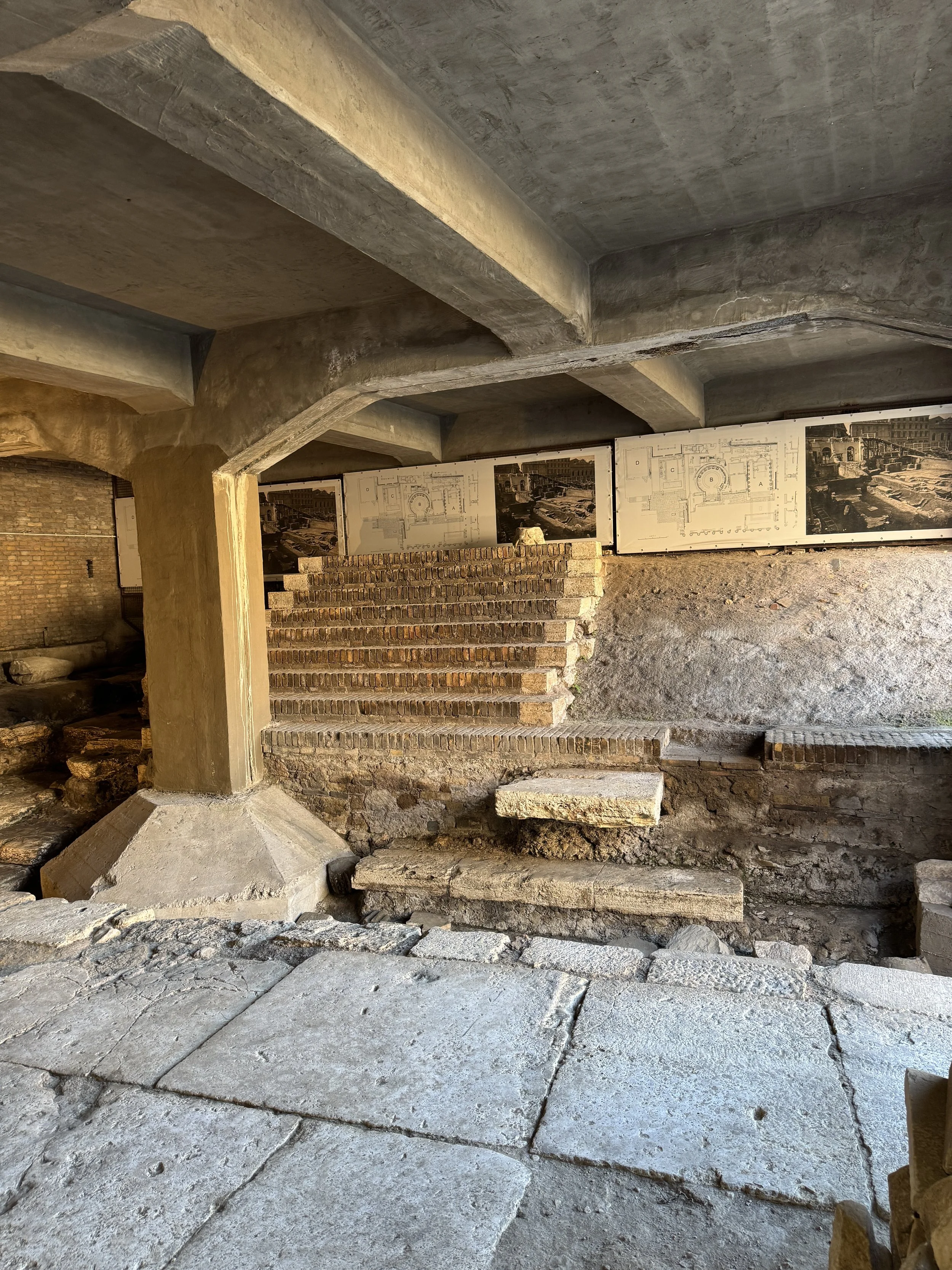 Area Largo Argentina, Rome. The remains of 4 ancient temples have been excavated below the level of the modern street. At the back is a portion of the Curia of Pompey where Julius Caesar was assassinated, paving the way for his heir Octavia Augusta to become the emperor and order the registration and taxation that brought Mary and Joseph to Bethlehem.