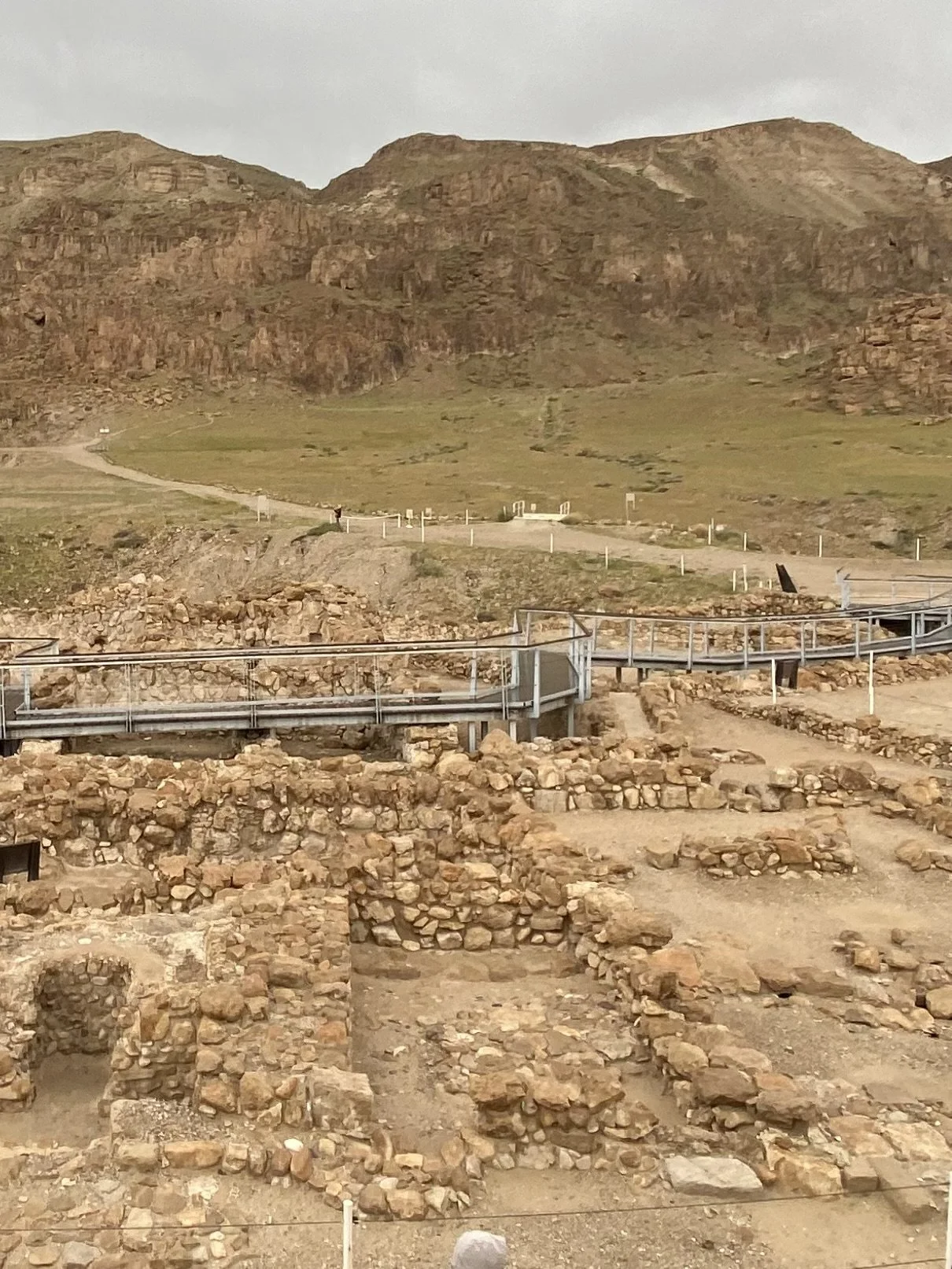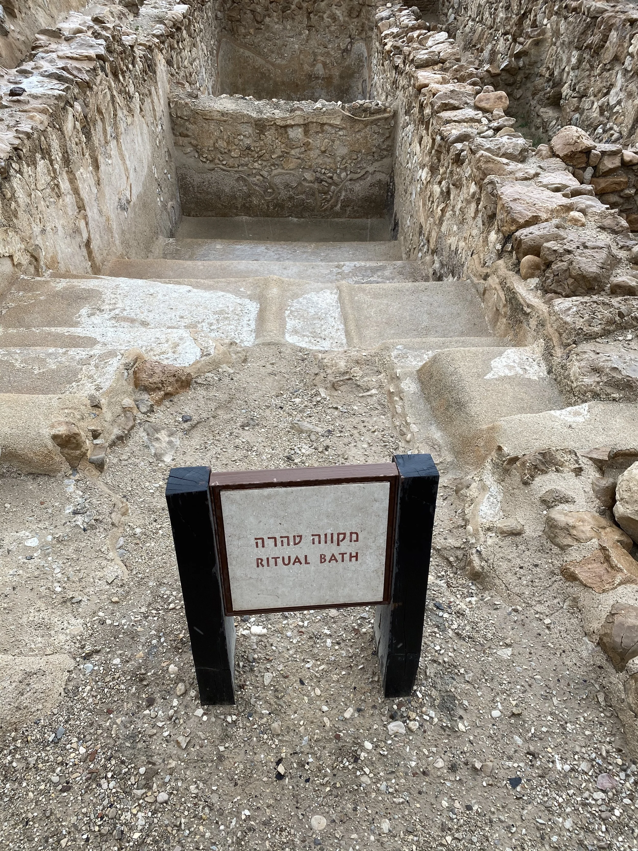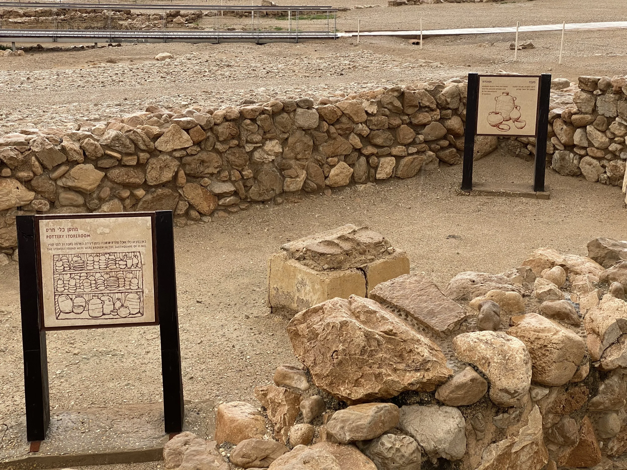 The settlement of Qumran is believed to have been a community of Jewish ascetics called the Essenes. They practiced a very strict communal lifestyle focused on studying and copying scripture and other important texts. Archeologists studying the site of Qumran believe it to have been inhabited from approximately 100 BC to 68 AD when it was destroyed by the Roman army during the time of the Jewish revolt. The excavations at the site have revealed mikvehs (ritual Jewish baths for purification), a communal hall and kitchen, a watch tower, cisterns and other living spaces. Many clay vessels have been found at the site and many ink wells. The site is 1 mile from the Dead Sea and about 6 miles south of Jericho. But of course the most famous thing about Qumran is the discovery of the Dead Sea Scrolls.