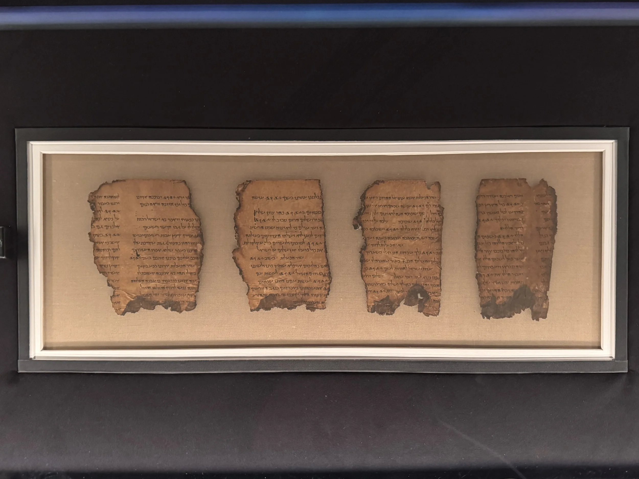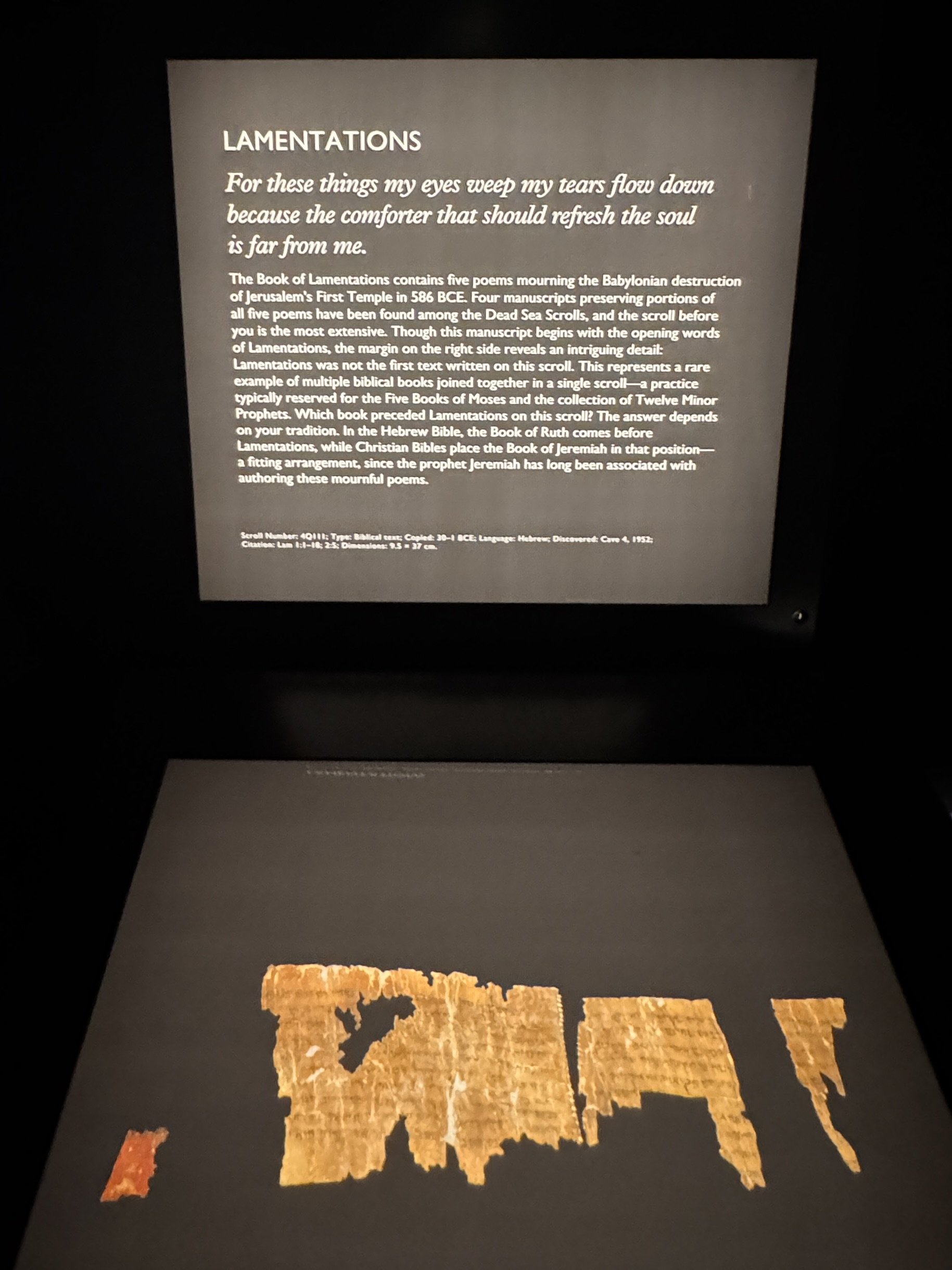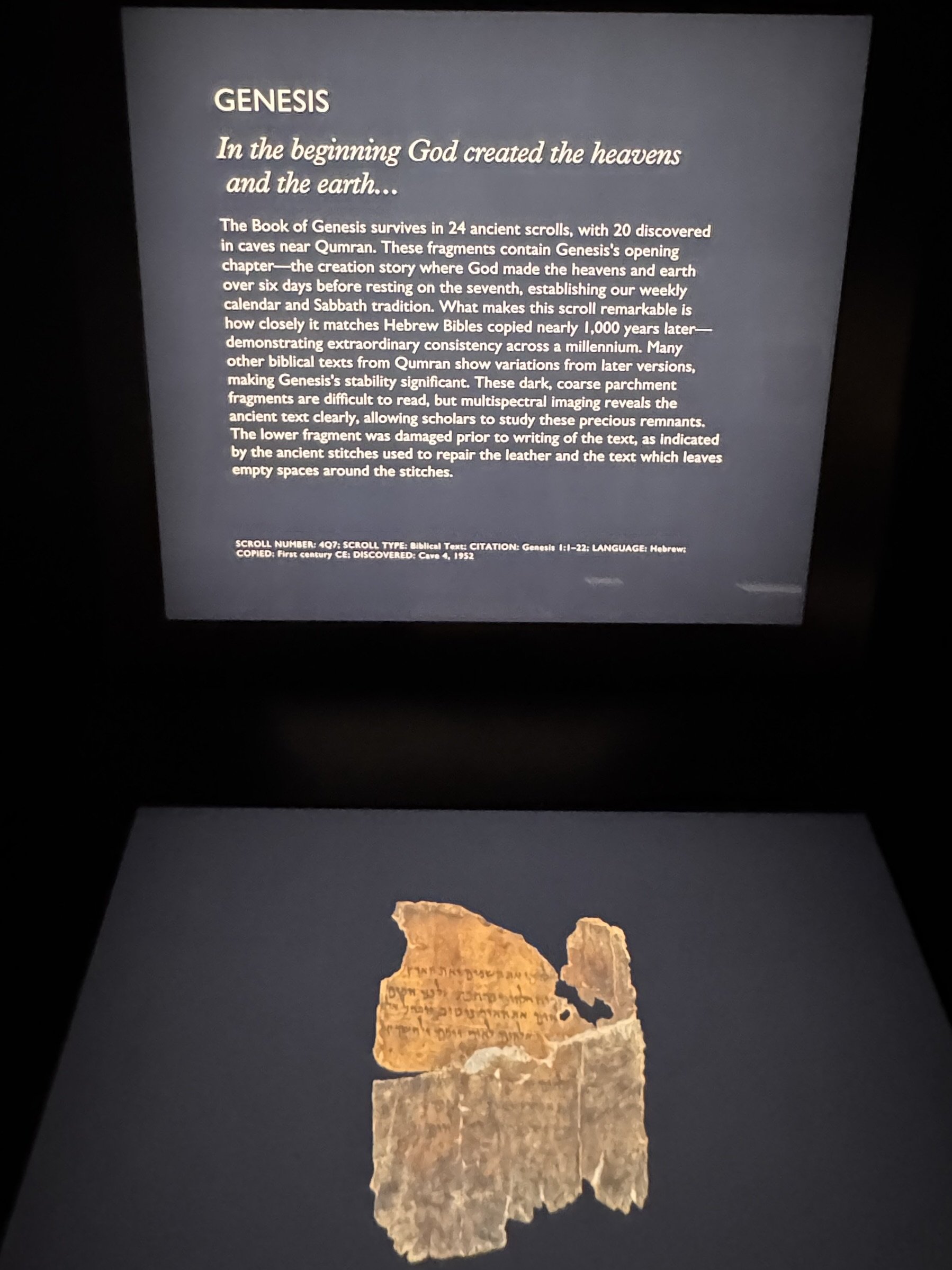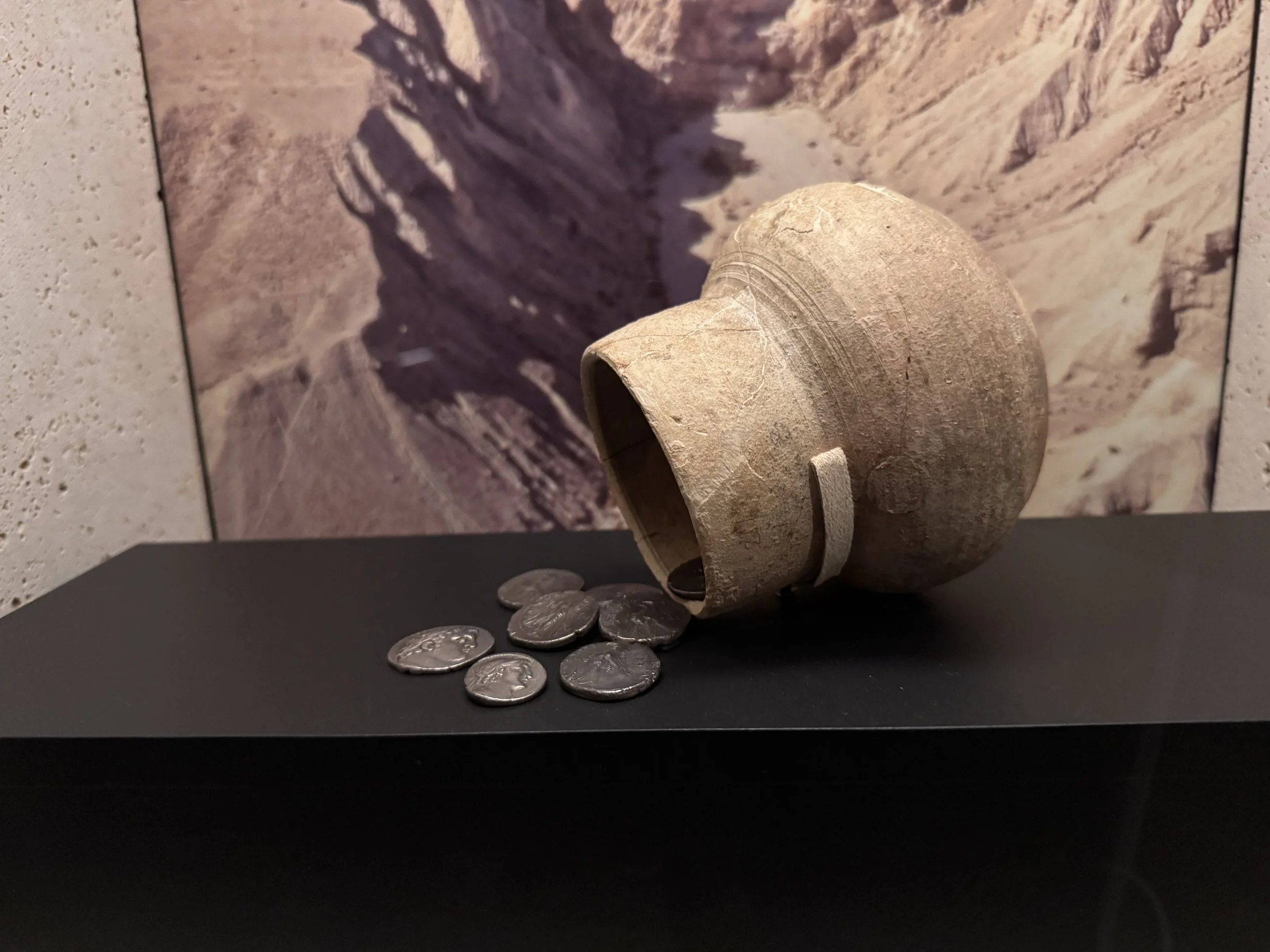The story is that around 1947, Bedouin shepherds discovered the first of the Dead Sea scrolls when rocks tossed into a cave broke storage jars containing copies of ancient texts and scripture. These text were written in Hebrew, Aramaic and Greek on parchment. Further investigation in the subsequent decades found 11 caves in the hills above Qumran with stored parchments in clay jars. Since that time, translating and preserving the finds has been an ongoing project. The Shrine of the Book at the Israel Museum is home to many scroll fragments on display. There are several scroll fragments currently on loan to the Museum of the Bible in Washington DC. Also on loan are numerous other artifacts from the Qumran settlement. We were excited to be allowed to take photos at the Museum of the Bible, where this if forbidden at the Shrine of the Book.