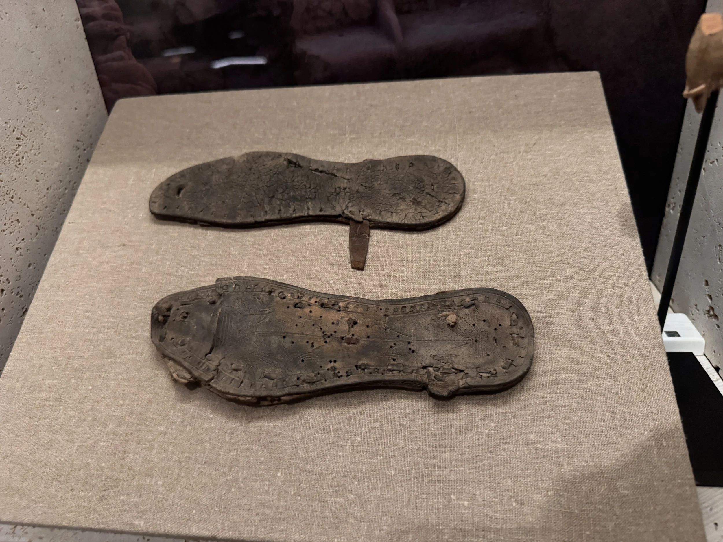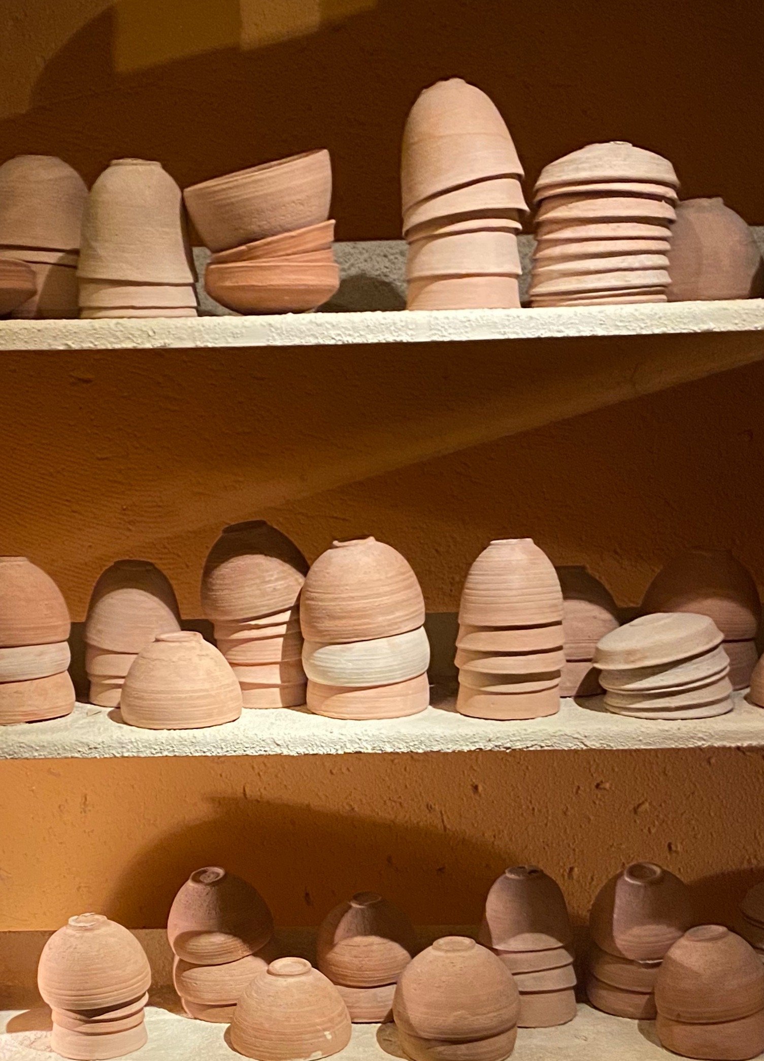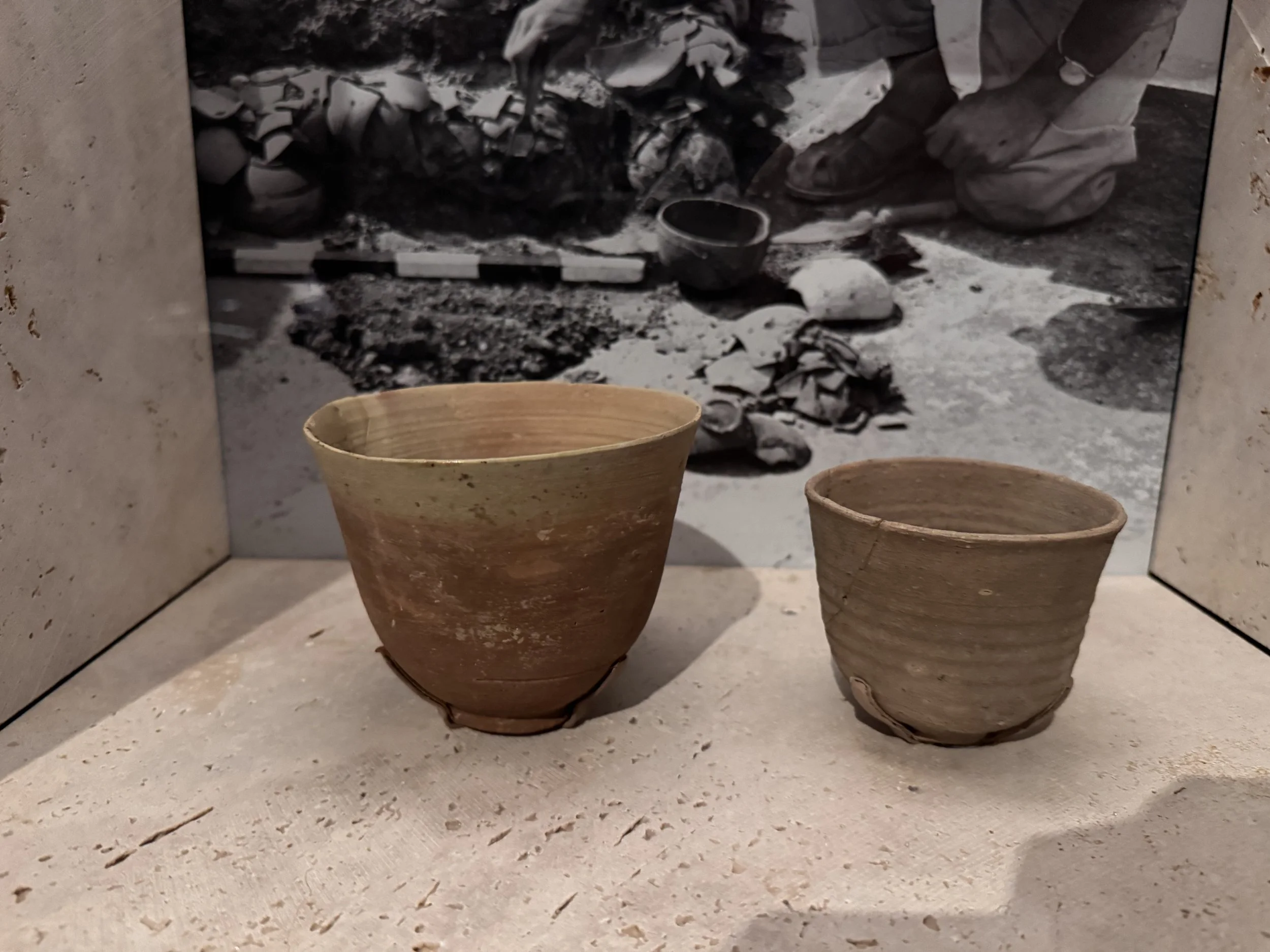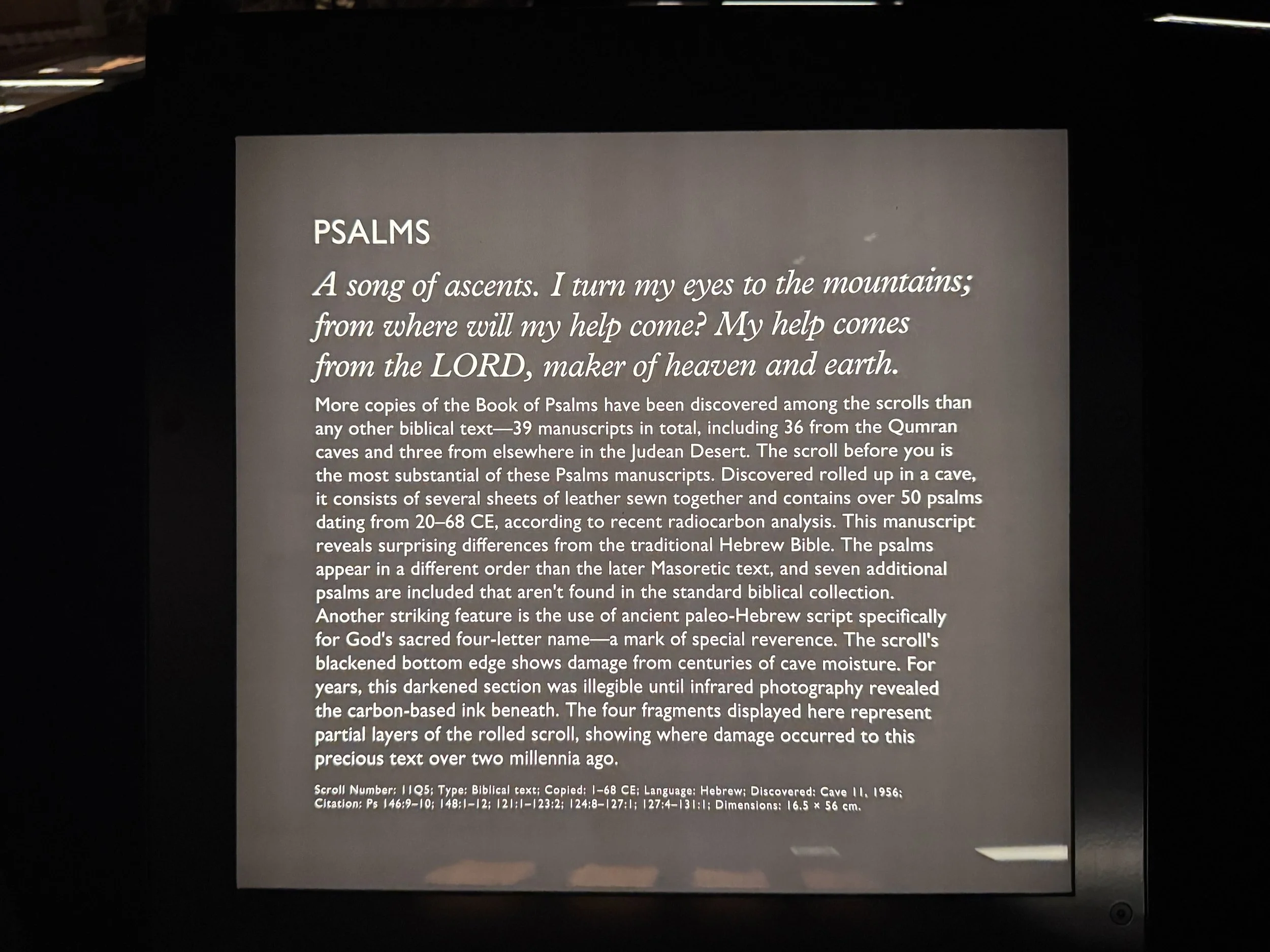 The story is that around 1947, Bedouin shepherds discovered the first of the Dead Sea scrolls when rocks tossed into a cave broke storage jars containing copies of ancient texts and scripture. These text were written in Hebrew, Aramaic and Greek on parchment. Further investigation in the subsequent decades found 11 caves in the hills above Qumran with stored parchments in clay jars. Since that time, translating and preserving the finds has been an ongoing project. The Shrine of the Book at the Israel Museum is home to many scroll fragments on display. There are several scroll fragments currently on loan to the Museum of the Bible in Washington DC. Also on loan are numerous other artifacts from the Qumran settlement. We were excited to be allowed to take photos at the Museum of the Bible, where this if forbidden at the Shrine of the Book.