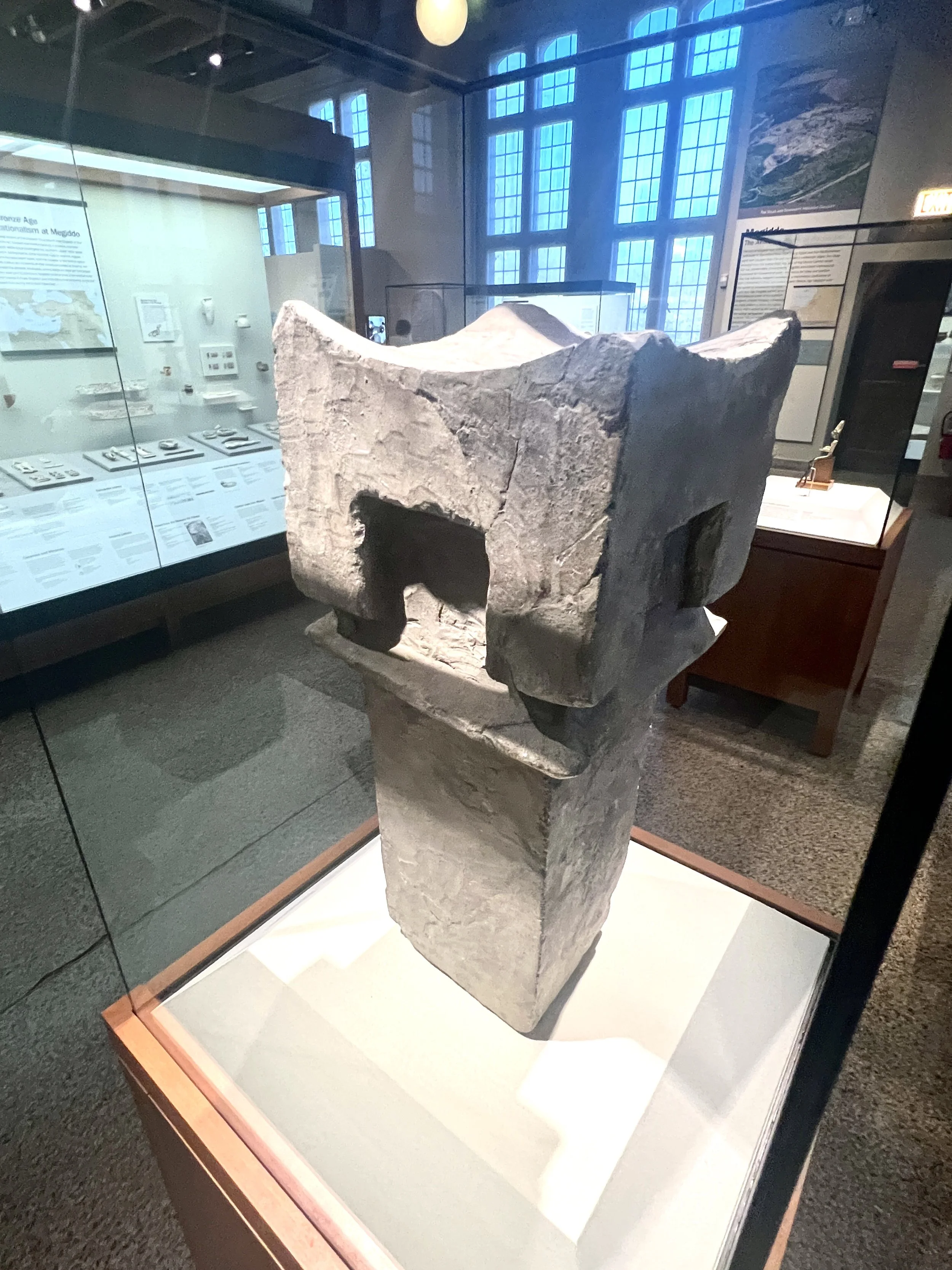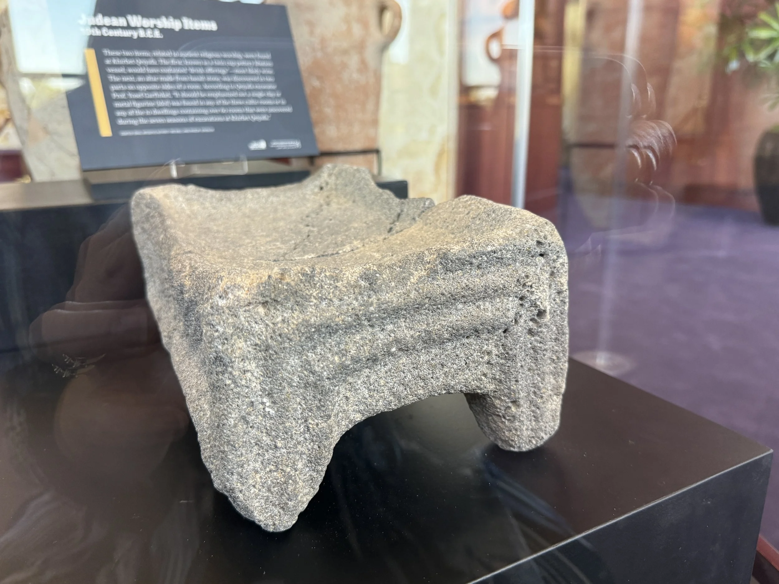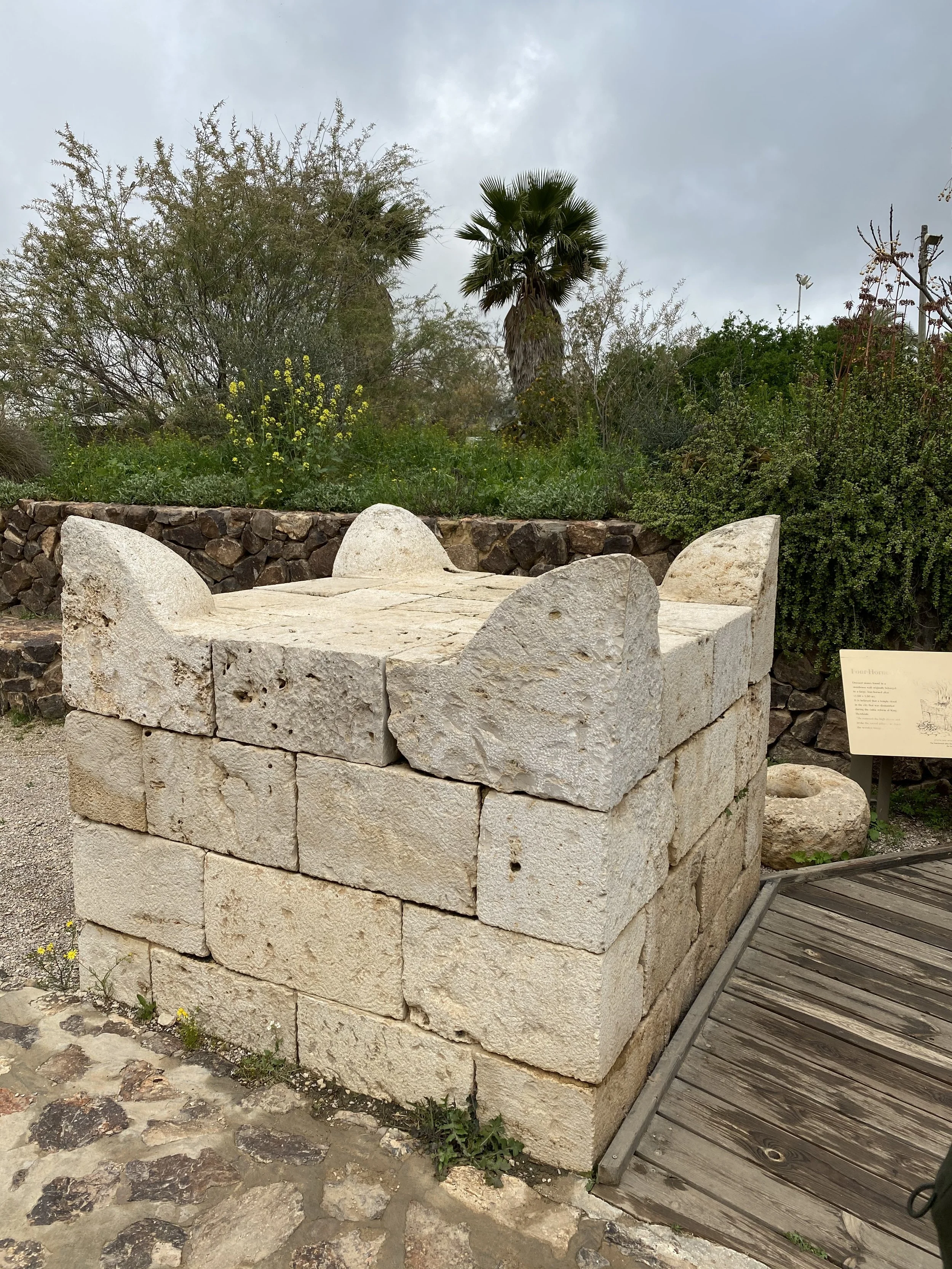 Four horned altars were common in the ancient Biblical world, and are described in detail in the Bible. Israelites rejected adornments to the altar such as images of magic or fertility. The Israelite four horned altar was a symbol of the strength of God’s authority and not a deity in its own right. As the verse from I Kings above demonstrates, clutching to the horns of the altar was a dramatic appeal for mercy or asylum. Blood from sacrifices was poured onto the horns as a symbol of atonement.