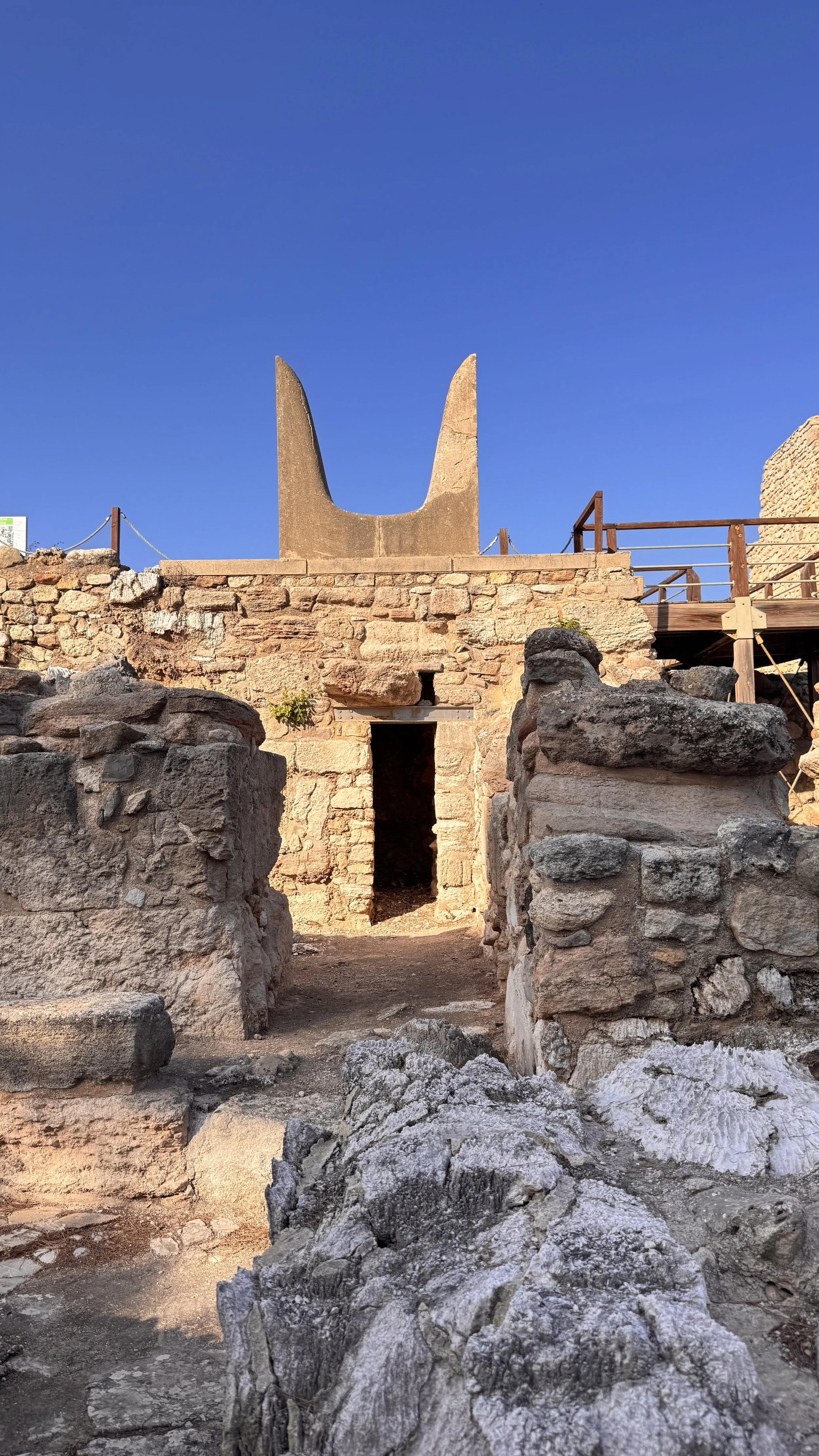 Tel Dan Israel. Iron Age city where the 9th century King Jeroboam of the northern kingdom of divided Israel corrupted worship of Yahweh with installation of a golden calf. Archeologists have found remains of a huge four horned altar including a piece with one of the horns. The metal frame illustrates the massive size of the altar.