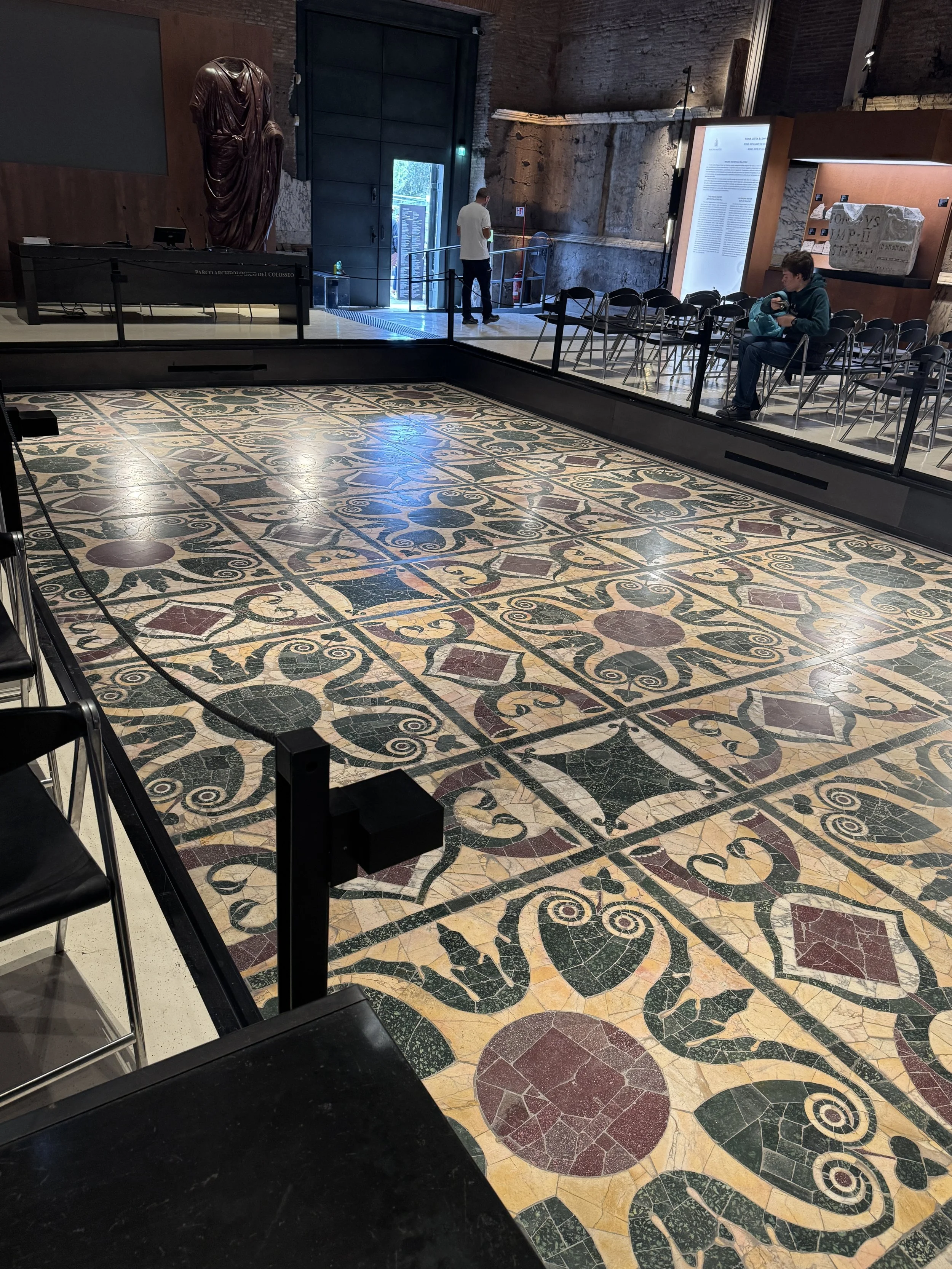> Opus Sectile (1st c BC - 3c AD): small cut marble or stone pieces arranged to form a geometric design. Used for flooring. Example from the Roman Curia in Forum at Rome.